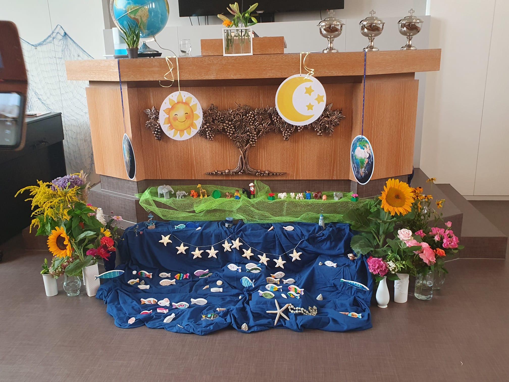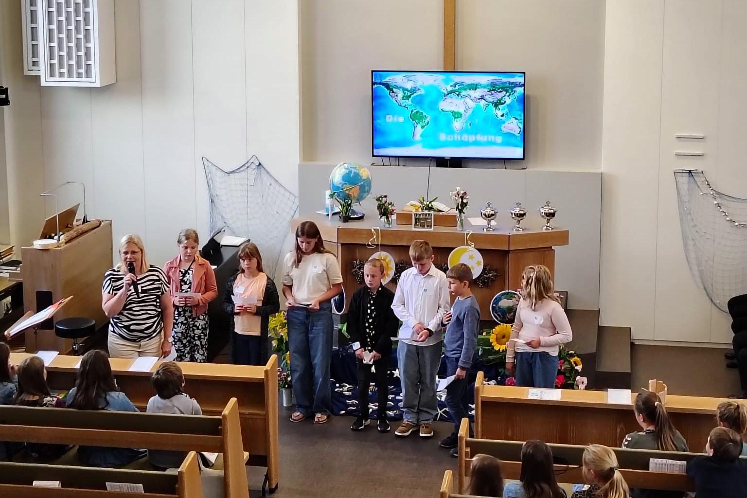 Der Kindergottesdienst bildete den geistlichen Auftakt des Tages. Das Bibelwort aus 1. Mose 1,31 – „Und Gott sah alles an, was er gemacht hatte, und siehe, es war sehr gut“ – stand im Mittelpunkt. Zunächst sangen die Kinder und Erwachsenen „Er hält die ganze Welt in seiner Hand“. Was berichtet die Bibel eigentlich über die Schöpfung? Diese wurde durch eine Präsentation beantwortet. Sieben Kinder trugen in kurzen Sätzen die einzelnen Schöpfungstage vor, während am Bildschirm hinter dem Altar dazu passende Bilder zu sehen waren. Die Gemeinde antwortete am Abschluss eines jeden Schöpfungstages mit dem Refrain des Kindertagsliedes: Sehr gut!